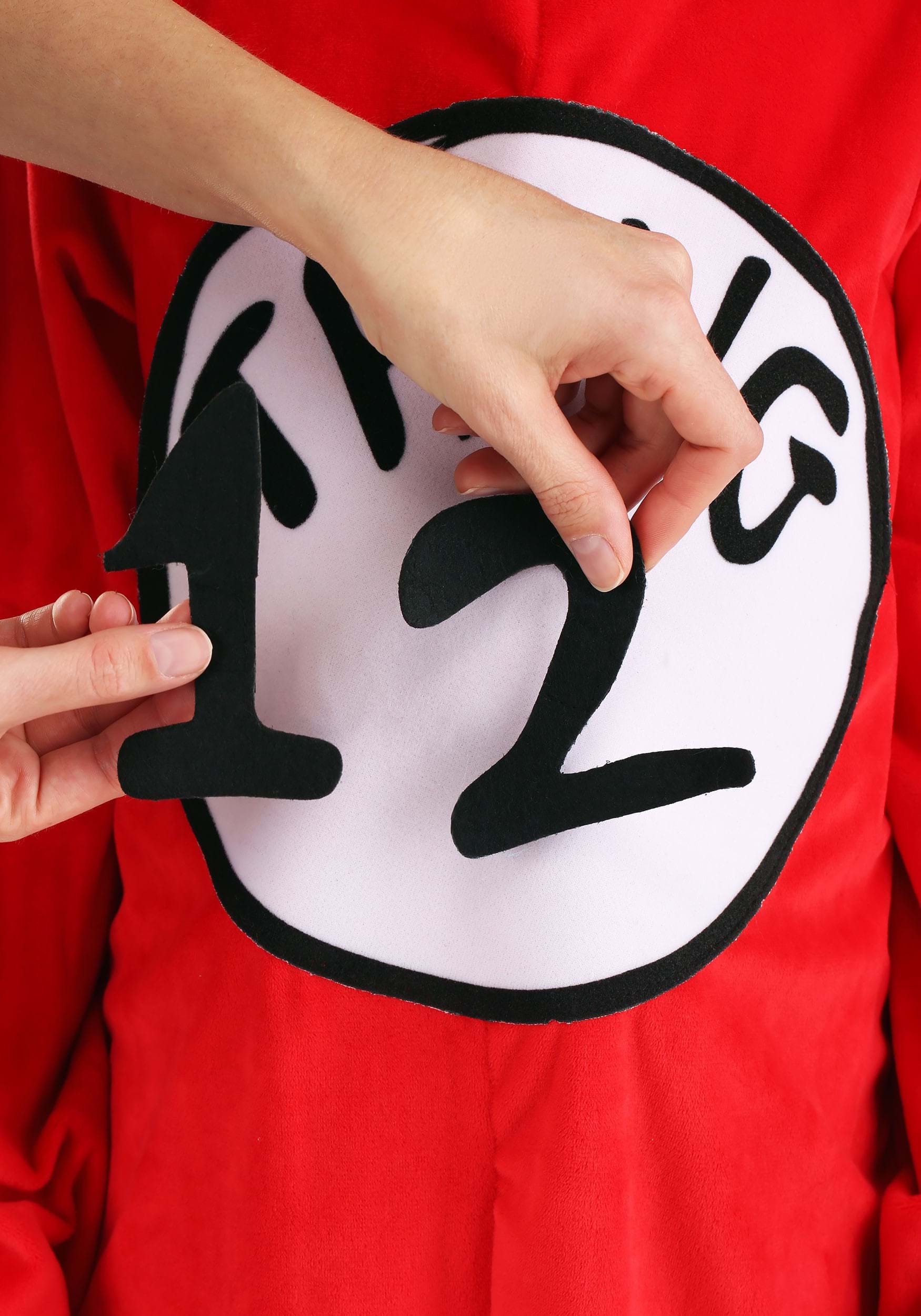 - Jumpsuit has felt patch on front with printed word "THING" above a space to place numbers
