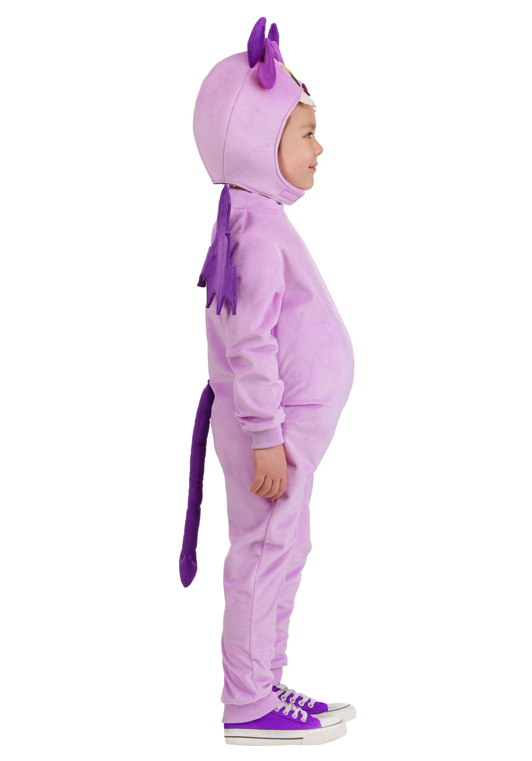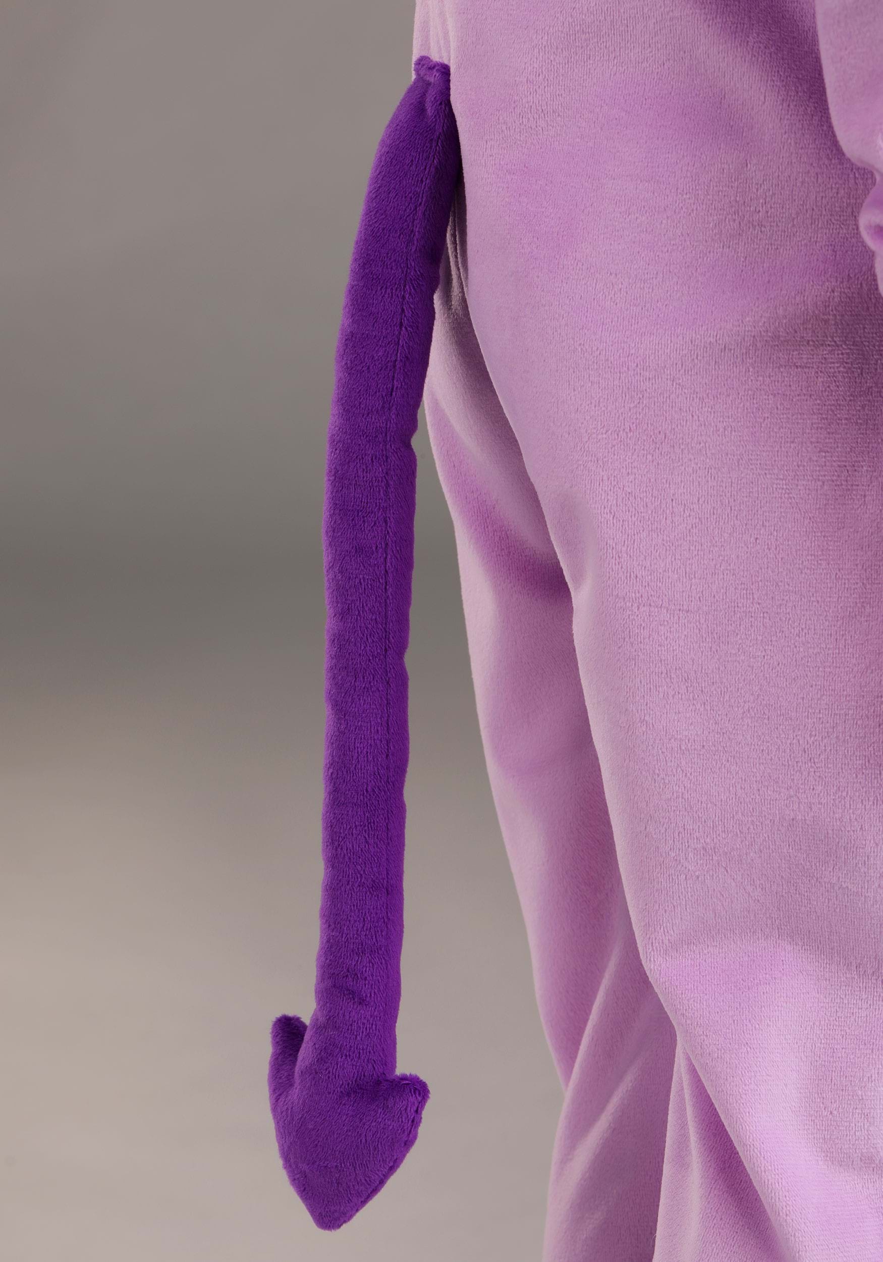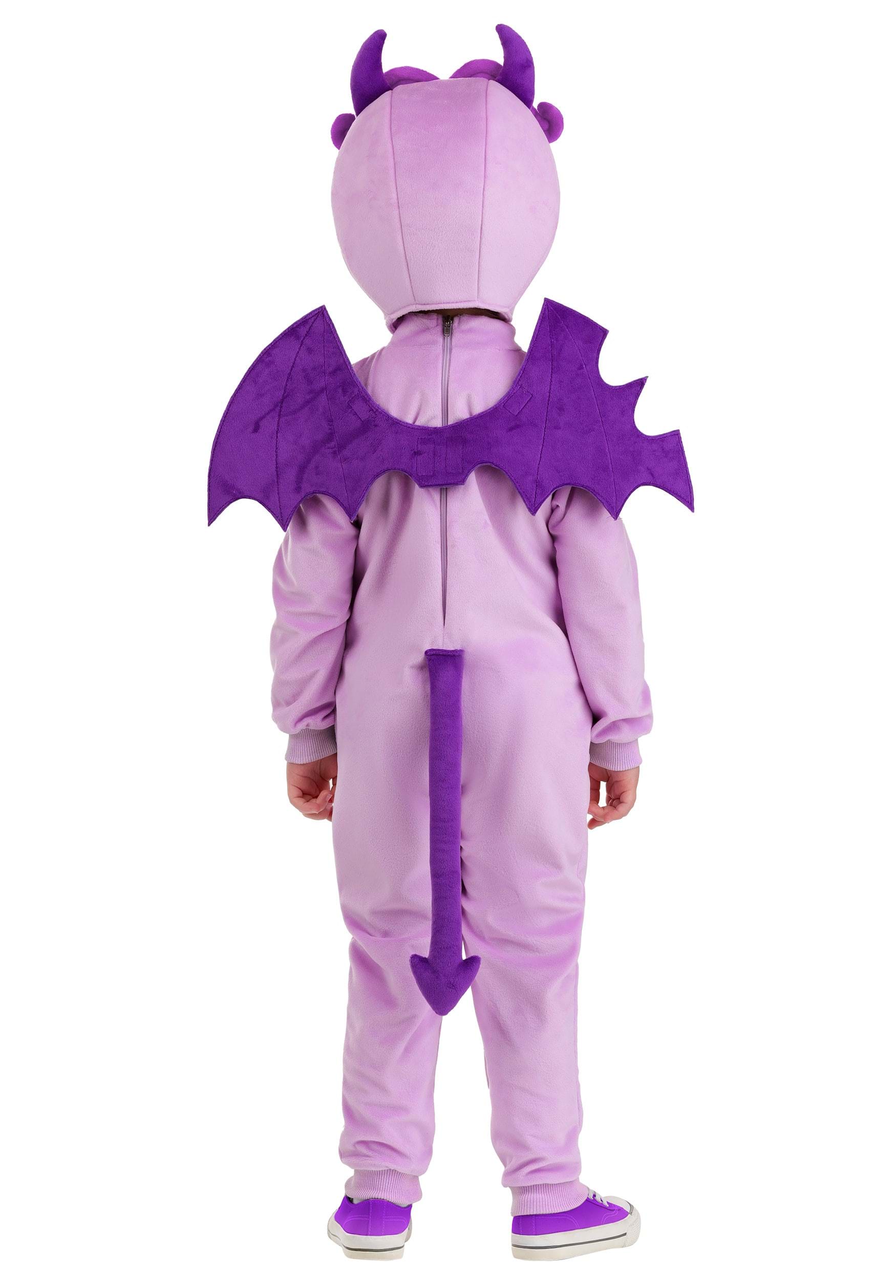 The soft purple cuddle-plush jumpsuit fastens with a back zipper for quick dressing, while rib-knit cuffs at the wrists and ankles ensure a snug fit. A polyfill tummy with a playful swirly belly button design adds charm, and the asymmetrical wings attach easily with hook-and-loop closures. The pointy tail and a headpiece with minky hair, horns, and embroidered details complete this devilish look!