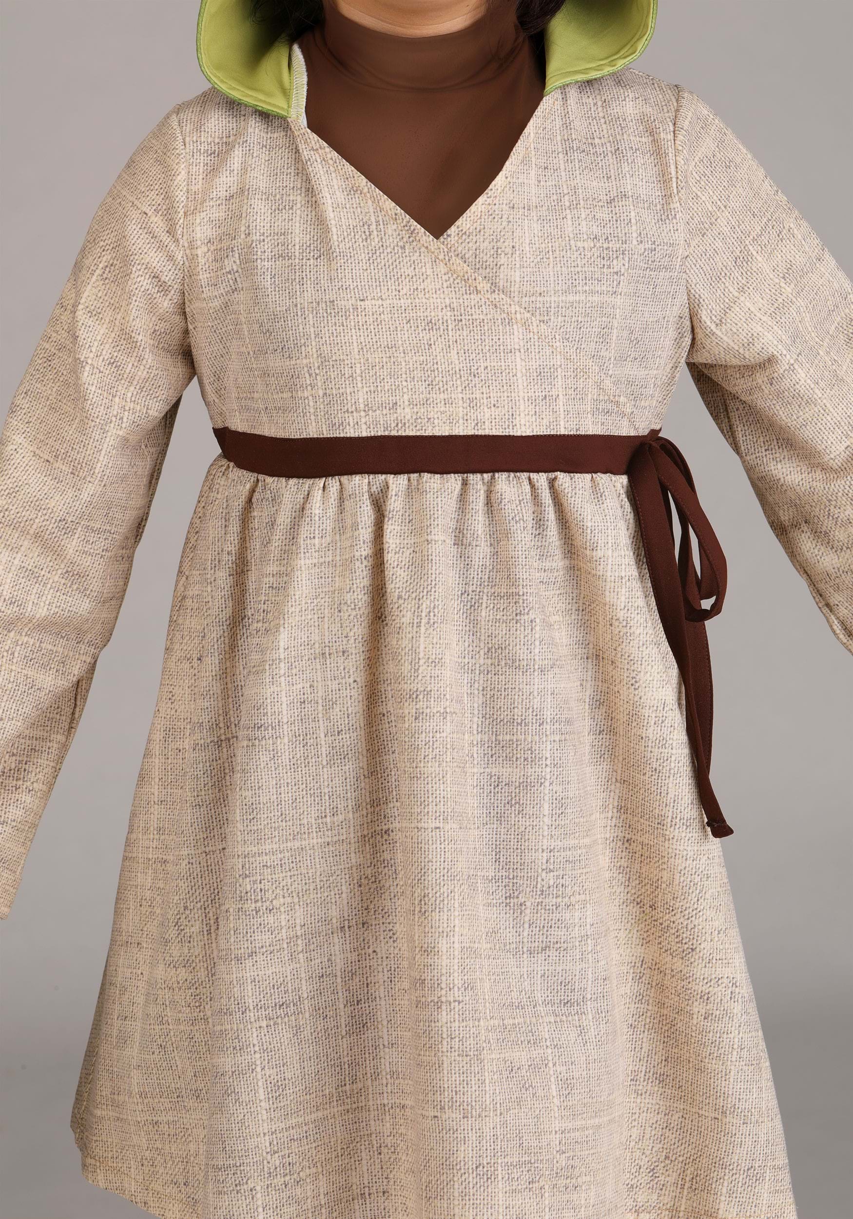 - Faux linen hooded dress has back elastic waistband, minky hood has foam backed ears with faux fur, polyester knit lining