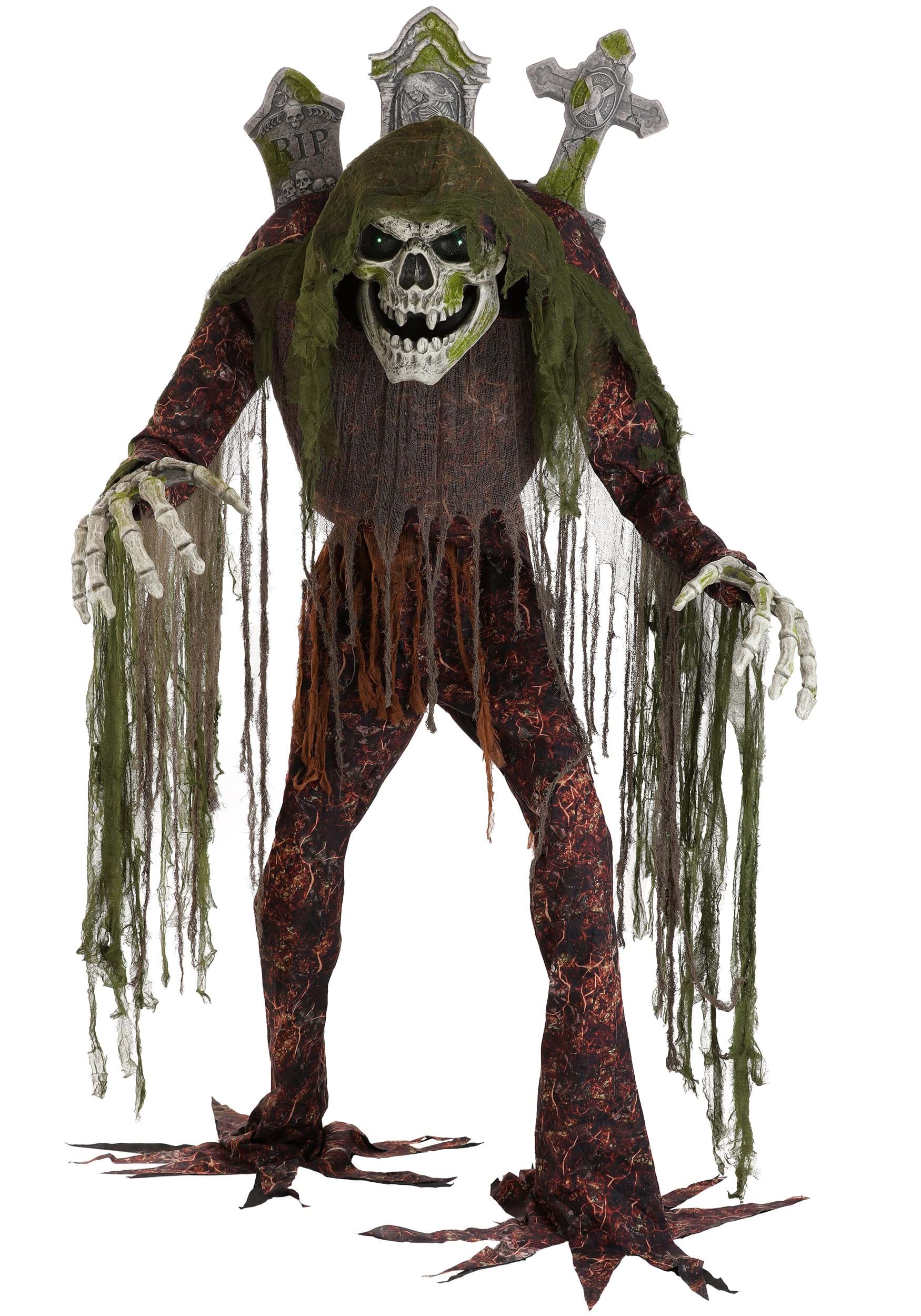 His robes are made from layered polyester fabric with moss-like texture, draped over a plastic body and reinforced metal frame. Tombstones rise from his back, adding dramatic dimension to his silhouette. For covered outdoor or indoor use only. Must be plugged into a GFCI outlet when used outdoors. Measures 7 feet tall and 4 feet 2 inches wide.