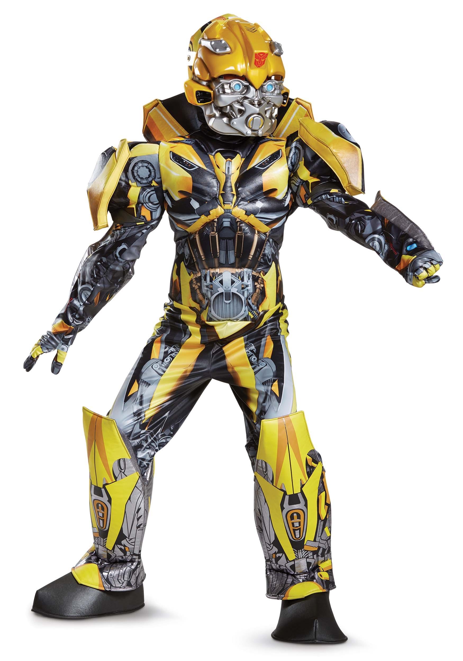 This officially licensed Transformers 5 Bumblebee Prestige costume is made from 100% polyester and features a back zipper for easy on and off. The jumpsuit includes padded shoulders, back, chest, arms, and boot tops, as well as printed gloves and an attached plastic mask. The attached padded shoulders and back pieces recreate the CGI appearance of Bumblebee from the movie.