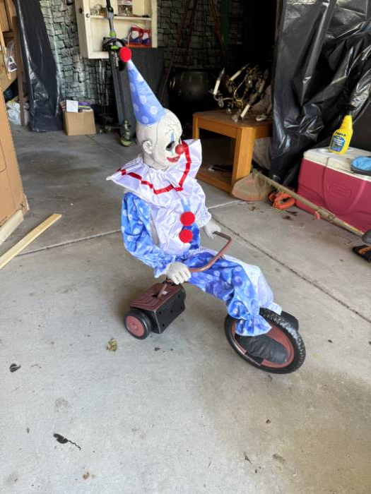 Sitting 3 feet tall, this animatronic clown features a metal and plastic frame dressed in a polyester clown suit that's somehow both festive and frightening. As haunting music plays, the clown's legs pedal the tricycle forward and back, while his blue-lit eyes pierce through the fog. He's basically the world's least fun carnival ride brought to life.