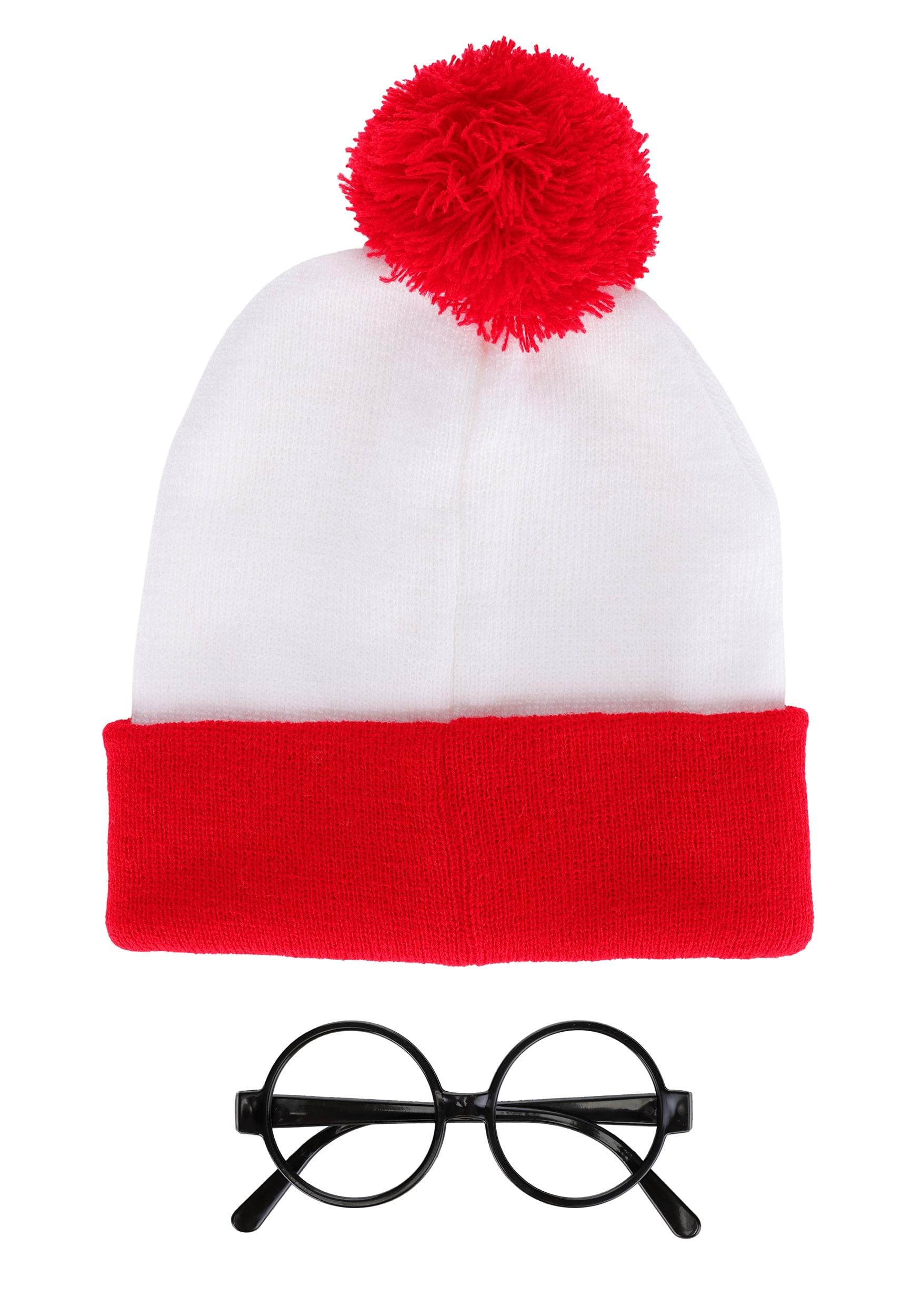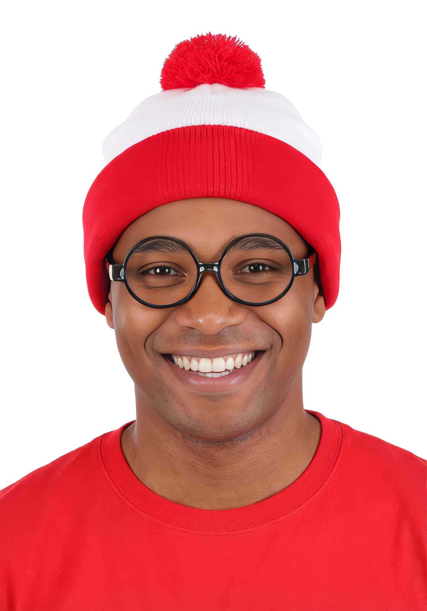The knit cap brings the whole look together with classic Waldo confidence. It features a white knit body with a bold red trim and a fluffy red pom on top, because subtlety has never been part of the assignment. The knit fabric keeps it comfortable for long stretches of standing around being searched for.