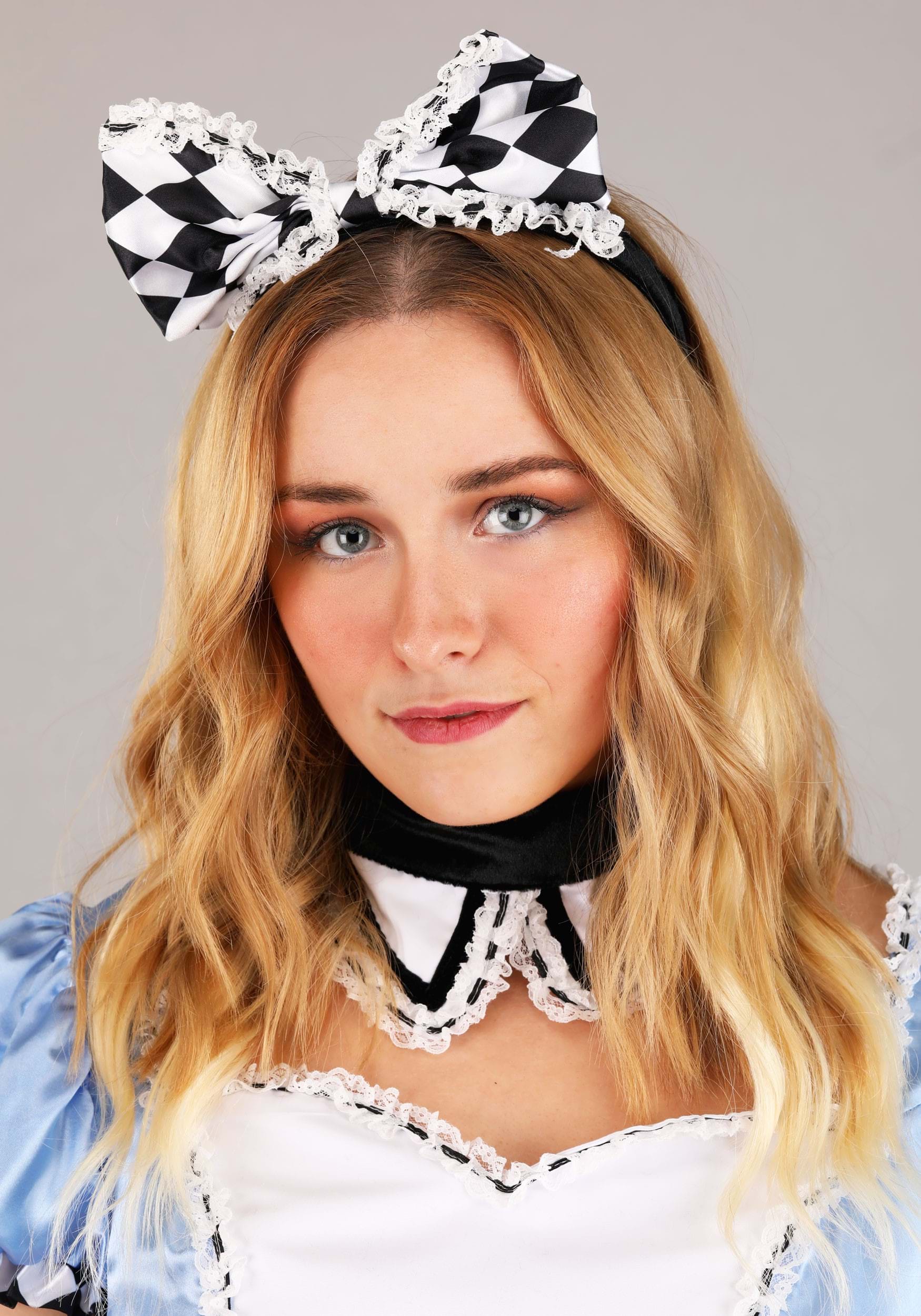 Next time you decide to follow a rabbit down a mysterious tunnel, make sure you do it in style with this Women's Alluring Alice Costume. This exclusive costume features a cute light blue satin-like polyester dress with puffed sleeves and a cotton apron sewn on the front. There’s adorable black-and-white lace and ribbon trim details, along with a black velvet bow belt with a hook-and-loop fastener on the back and a velvet collar with ply-cotton lapels. The dress has a zipper down the back for easy wear. There’s also a cute black headband with an attached black-and-white satin bow. (The gloves, purse and boots are sold separately.) We promise this dress looks equally adorable whether it’s been shrunk down to dormouse-size or blown up so big that it fills a house!