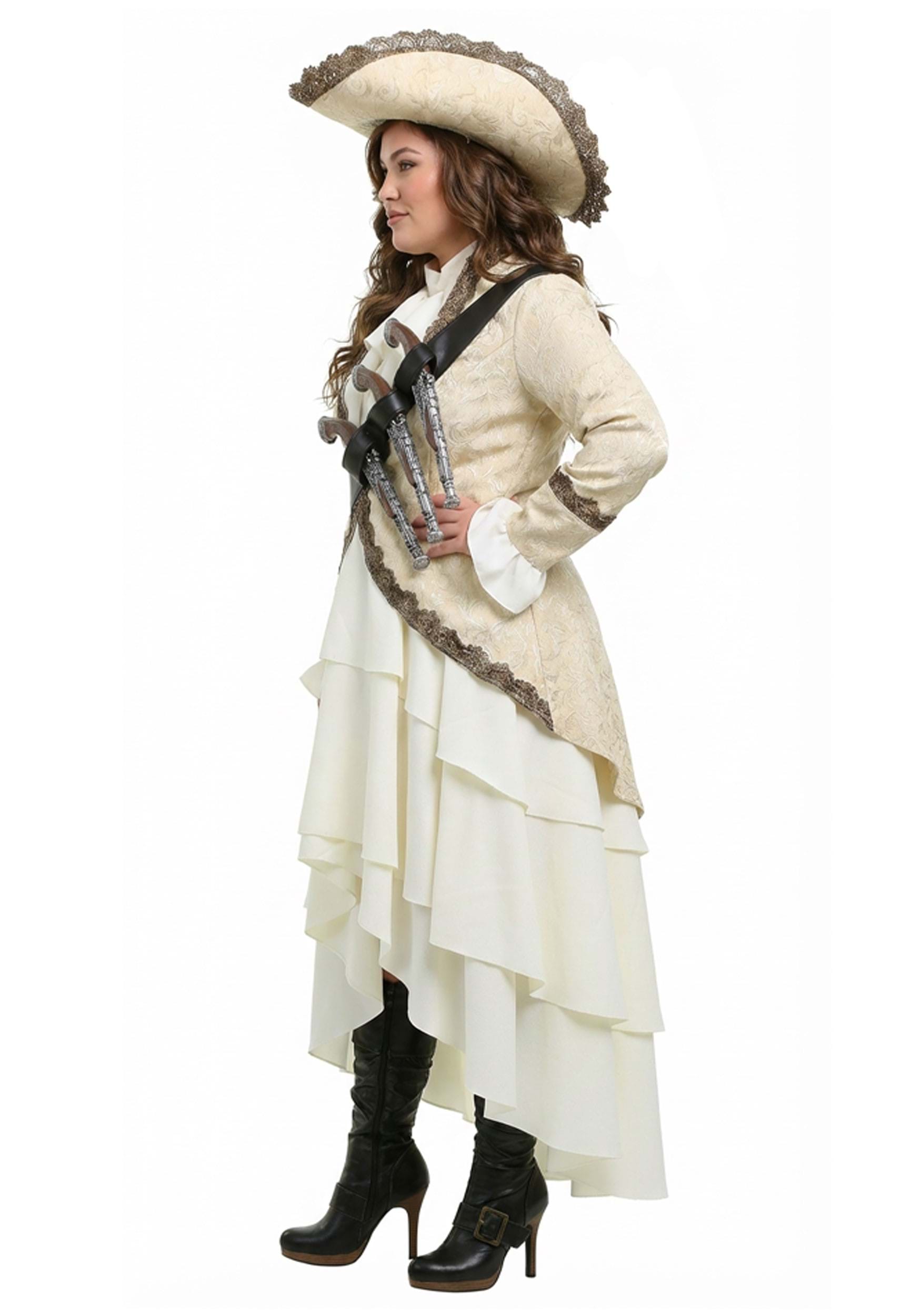 You'll look like the epitome of a sophisticated captain of the 1600's in this ivory lace-trimmed jacket and white layered skirt. You'll retain that sense of authority with the wide brimmed hat while the cross belt with room for three weapons of your choosing will let those equally two-faced authorities know that you're no one to be trifled with. Just be sure to have fun with your sharp new look, after all, what's the pirate's life for if you can't have any fun with it!