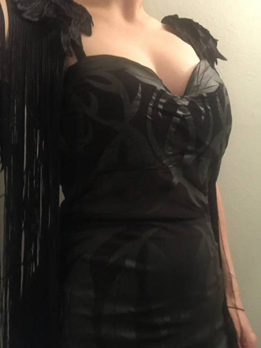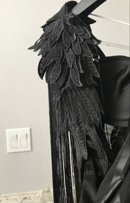 Height 5’0” | Weight 120 lbs | Size MediumMind blowing quality, fully realized finishes, and very comfortable! The black shoulders are actually lace appliqué feathers that continue halfway down the back (no need to buy wings!). Insider tip- when you take it out of the package: roll the wax paper away, don’t lift it straight up off the costume. Do not store where rubberized design can touch itself- sticking possibility. (Or dust it with black eyeshadow. Whatev.)