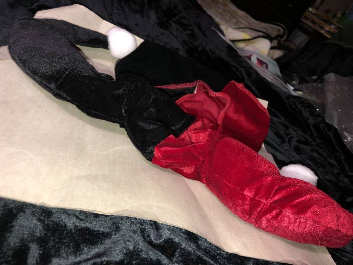 -The hood is horribly misshapen & uneven. There is NO neck to it!! It’s completely missing. The red horn is over filled while the black horn is grossly under filled & flat. The front forehead area of the hood does not come down to a point like a heart as shown online. It is mostly flat or round w/ the red side mishapen. The trim around the face is ghastly. That is a serger machine’s finish for INSIDE of a garment that was used. It looks undone/unfinished. (The proper finish of an edge includes the material being tucked under & sewn.)