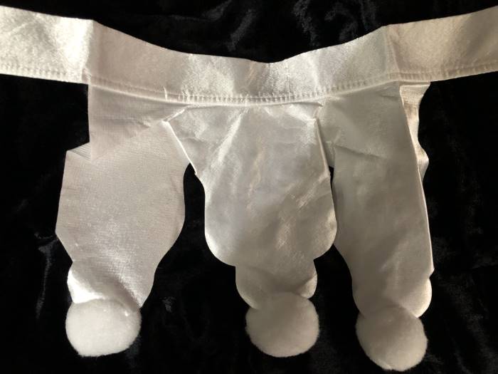 - Collar piece has attached pom poms at front with hook and loop closure at back