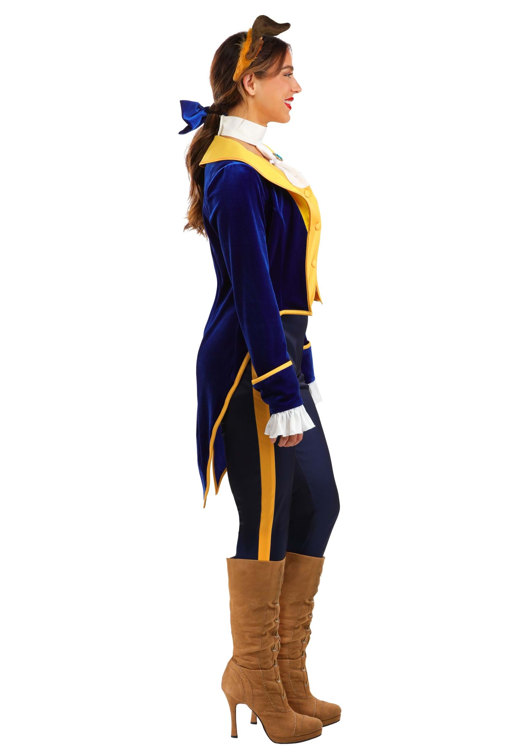 This 6-piece costume starts with dark navy pants featuring a stylish stripe and an elastic waistband for a comfortably snug fit. A coordinating vest with color-matched buttons and a hook-and-loop fastened jabot with a faux gem brooch creates the top of the costume. A blue velvet jacket with long tails, golden details, and ruffled cuffs layers over the ensemble. Meanwhile, a headband with horns and ears and a blue velvet hairbow perfect the costume's polish.