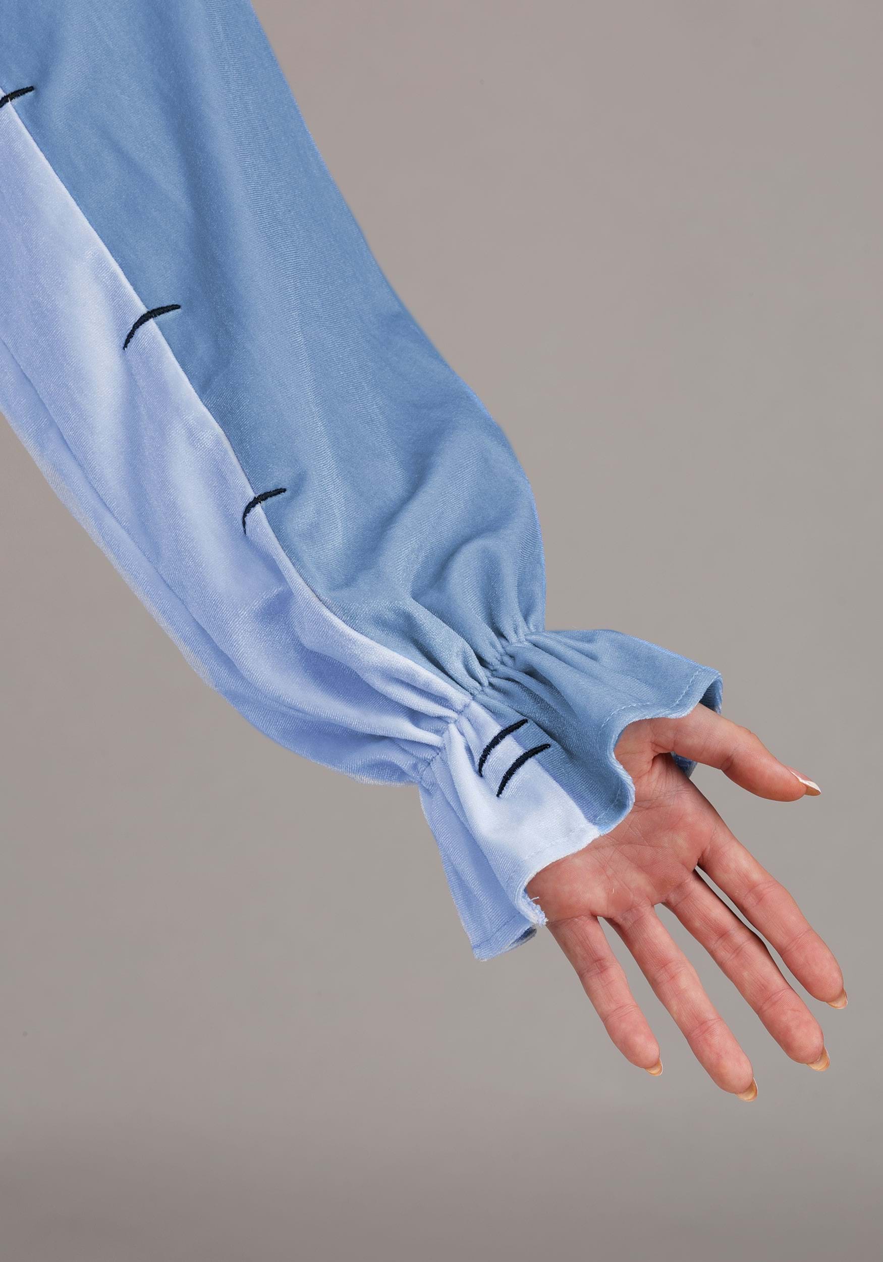 - Stretchy velvet dress has zipper down center back, embroidered stitching details, elastic in the wrists and shoulders of the sleeves