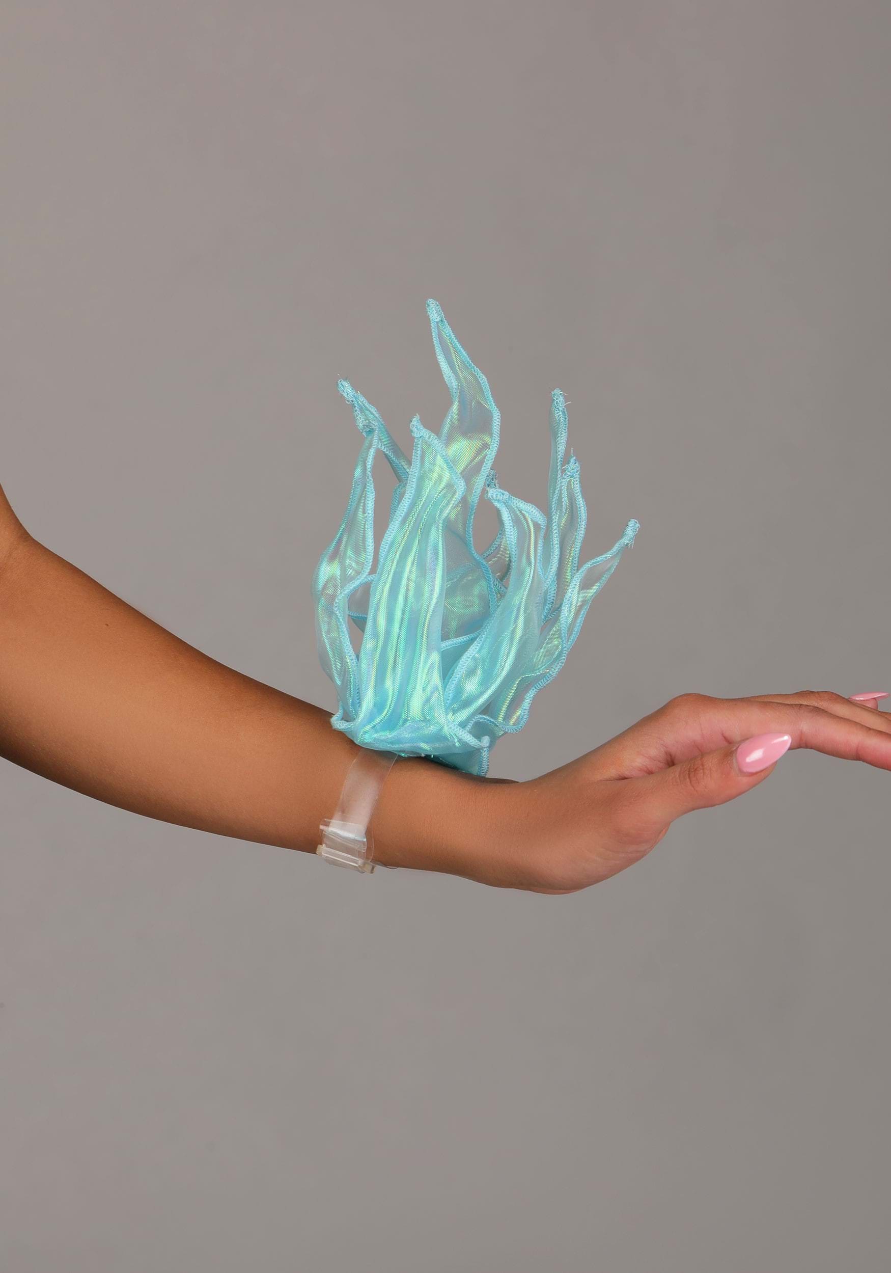 - Fabric covered elastic wristband has iridescent organza with posable wire, LED clear light, on/off switch, requires 3x cell button batteries