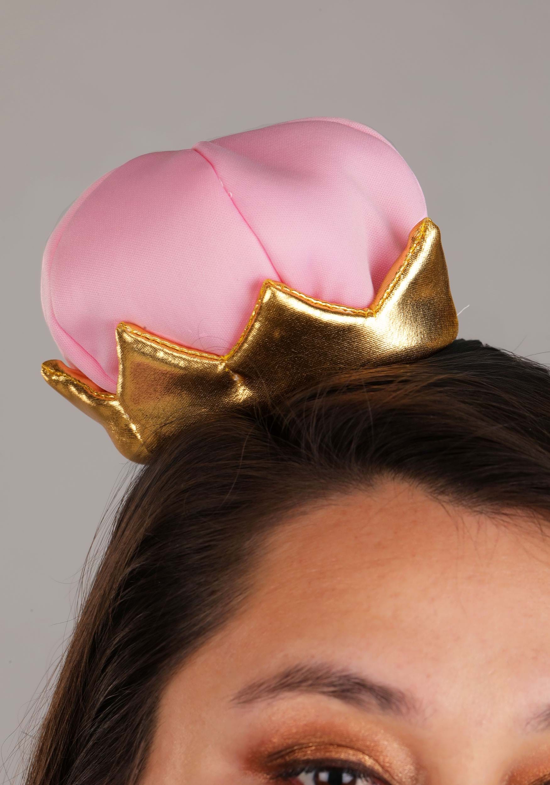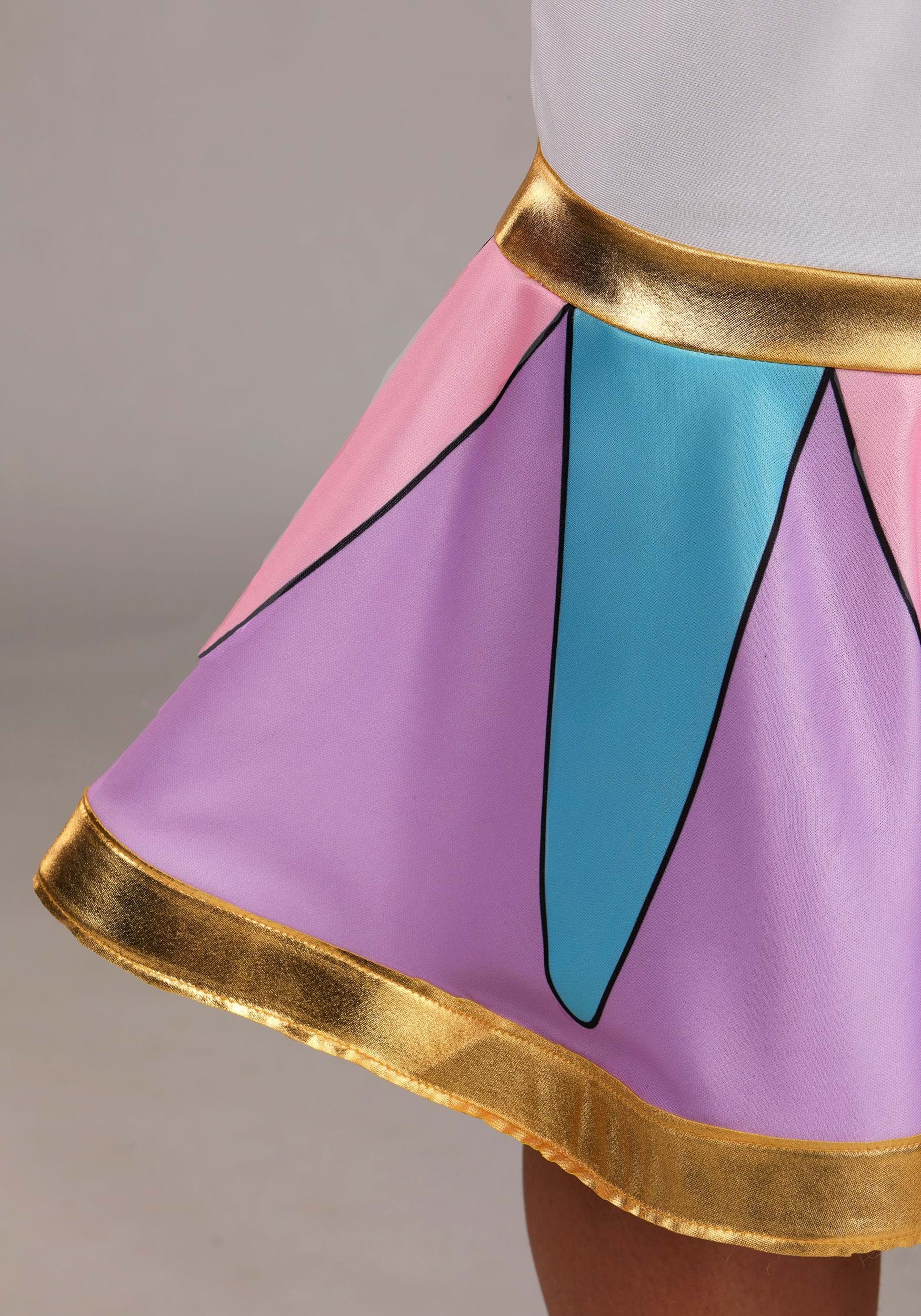 This four-way stretch jersey dress features a vibrant swirl of purples, pinks, and blues, with a shimmering gold lamé sleeve and matching trim along the skirt. The soft purple stretch jersey collar is edged with gold trim and secures comfortably in the back. Topping off the look is the foam-backed knob hat, easily secured to your hair with metal alligator clips for a playful, teapot-inspired finish.
