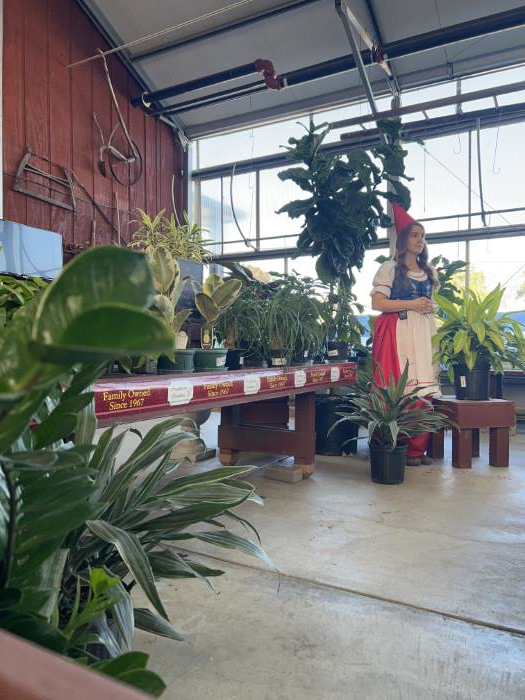 This Made by Us Gnome costume is instantly recognizable by garden fans around the world. It features a dress with a full-length red skirt and lace-up bodice that's trimmed in a gorgeous printed floral design. No need to fiddle with the strings each time, this dress zips up the back for your convenience. A ruched blouse is layered underneath the bodice, matching with the clean tie-on apron. And of course, this look is topped off with a red hat to make your magical gnome appearance complete!