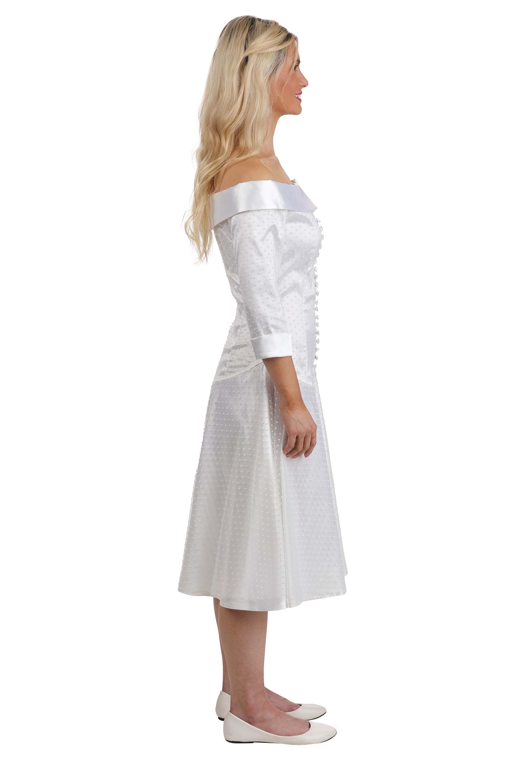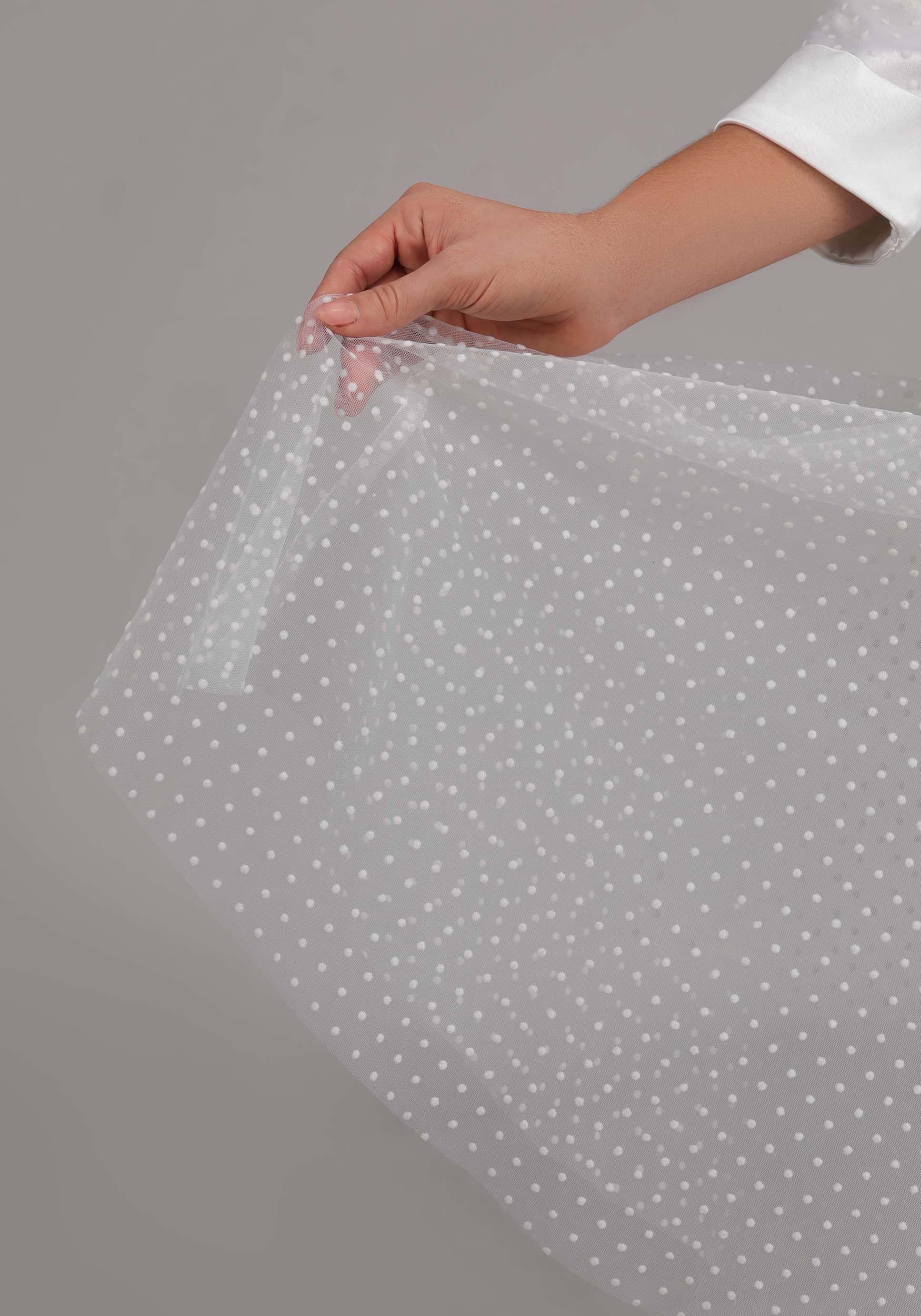 But wait, there's more! The flocked dot mesh overlay adds a subtle texture to the sleeves and skirt, giving the whole dress that soft, ethereal vibe. And down the center front? Fabric-covered shank buttons, because even in a world of scissor-handed sweethearts, details matter.