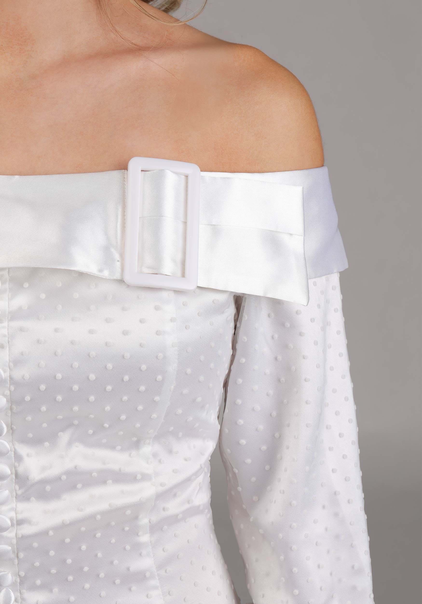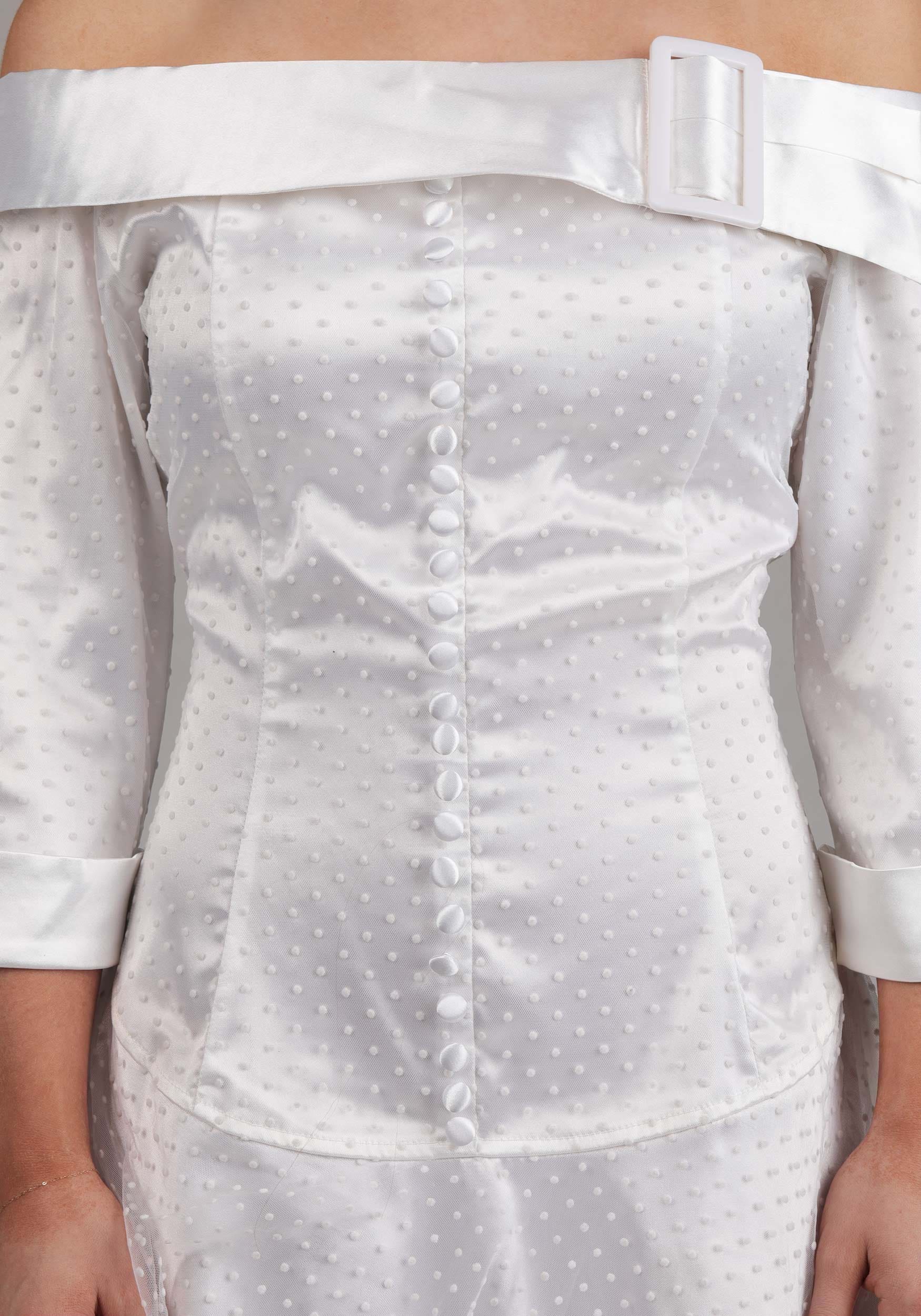 Made from stretch satin, the full dress offers just the right balance of comfort and structure, with a hidden back zipper to keep things sleek and simple. The 3/4 sleeves are finished with hemmed cuffs, while the off-the-shoulder collar adds that perfect touch of romantic drama, complete with a plastic buckle accent that's straight from Kim's iconic look.