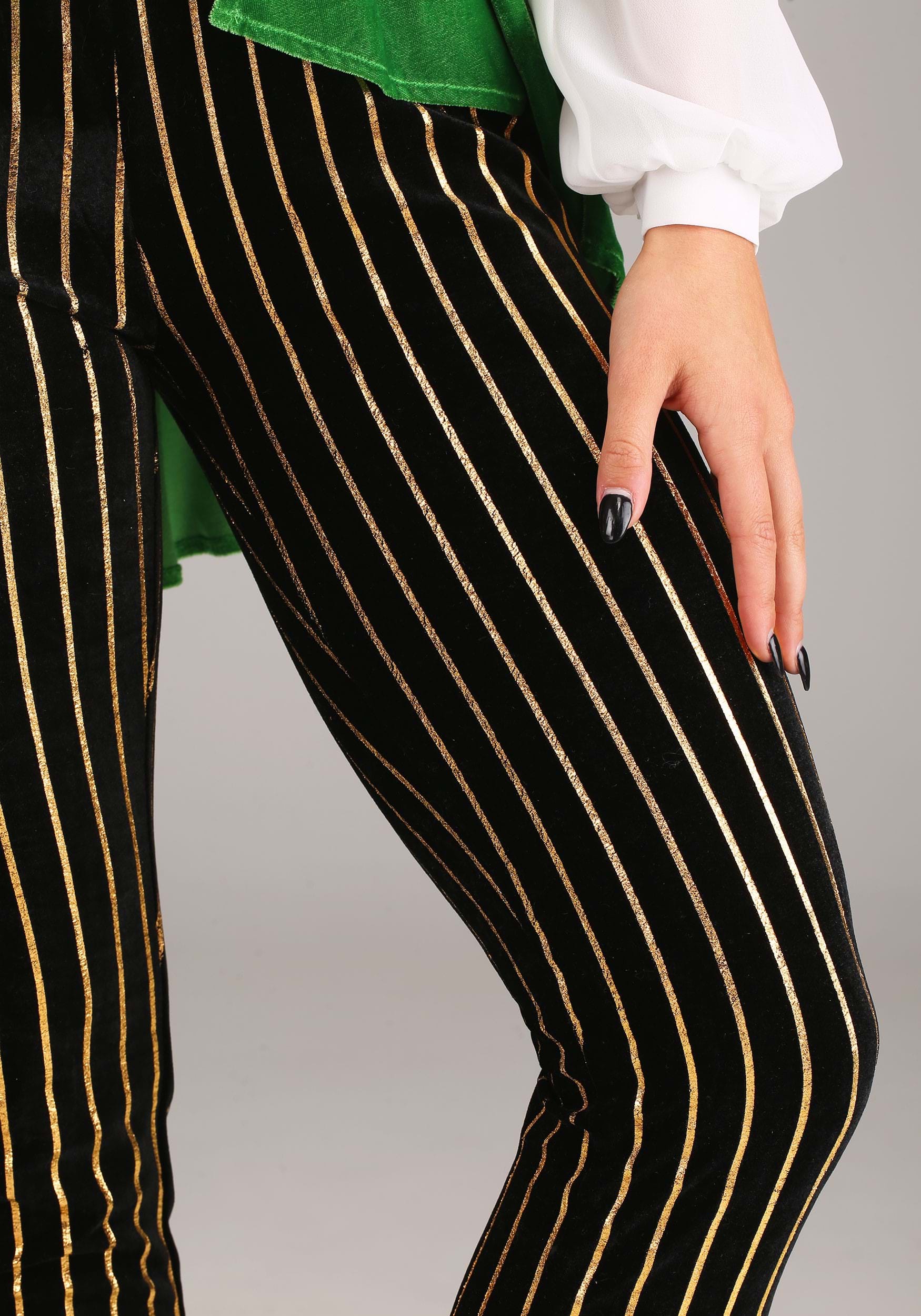 This exclusive Lavish Leprechaun Women's Costume contains all the luck you'll need to have an amazing St. Patrick's Day! The sleeveless green velour top is designed to look like a vest, with gold-tone shamrocks and vines embroidered on the black lapels, a double row of golden buttons running down the front, and an asymmetric hemline that's longer in back. It looks festive and fun when worn over your favorite button-up shirt. The black leggings have a comfortable elastic waistband and have narrow metallic gold stripes printed along their length. The headband with its attached mini top hat is the perfect addition to your hairdo!