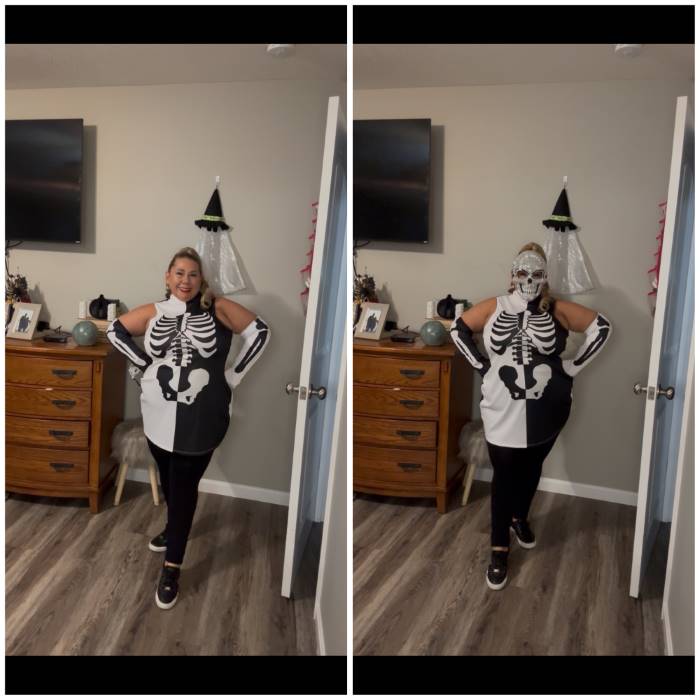 Whether you're haunting your neighborhood trick-or-treaters or dancing the night away, this black and white plus-size skeleton costume is the perfect way to bring your brand of X-factor to your next Halloween celebration!