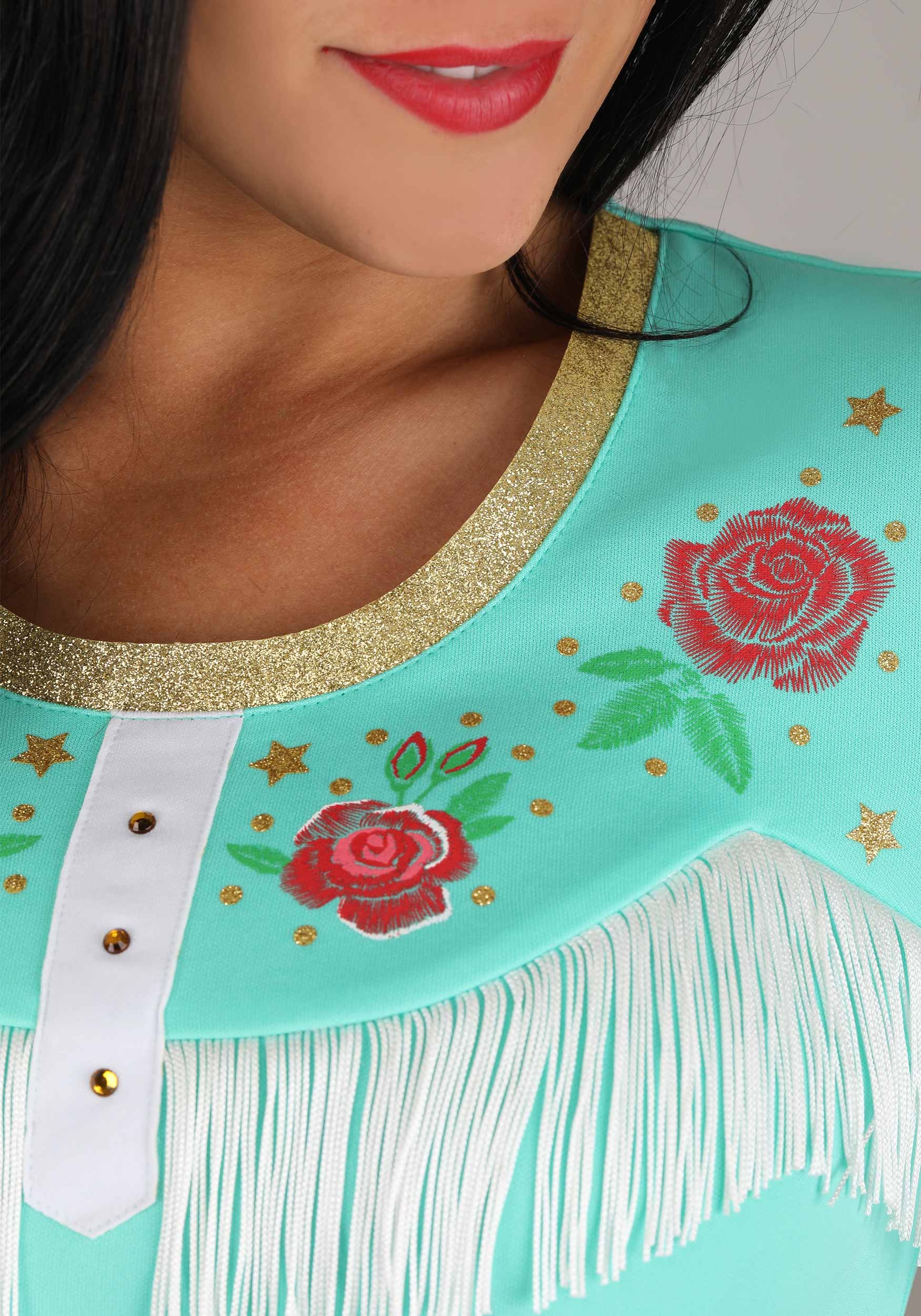You can sing your heart out when you wear this Women's Country Star Costume Dress. The plus size outfit is modeled after dresses worn by various country Western stars throughout! It consists of a pullover-style dress that stretches for a comfortable fit. The turquoise color strikes a vibrant contrast to the red flower patterns around the skirt and along the chest.