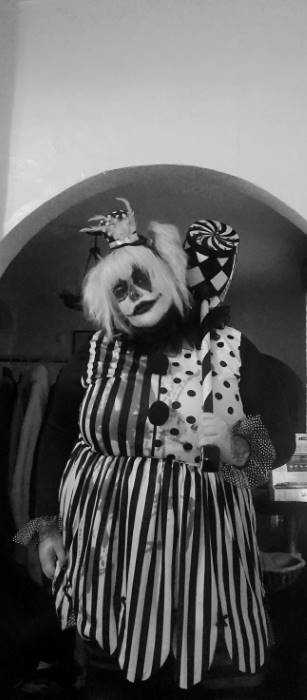 …that you will love this costume! It has just the mixture of scary and sweet to meet your needs. The black and white looks amazing under a black light and under normal light the lone red stripe of the knife really completes the outfit. You will own the room for sure!