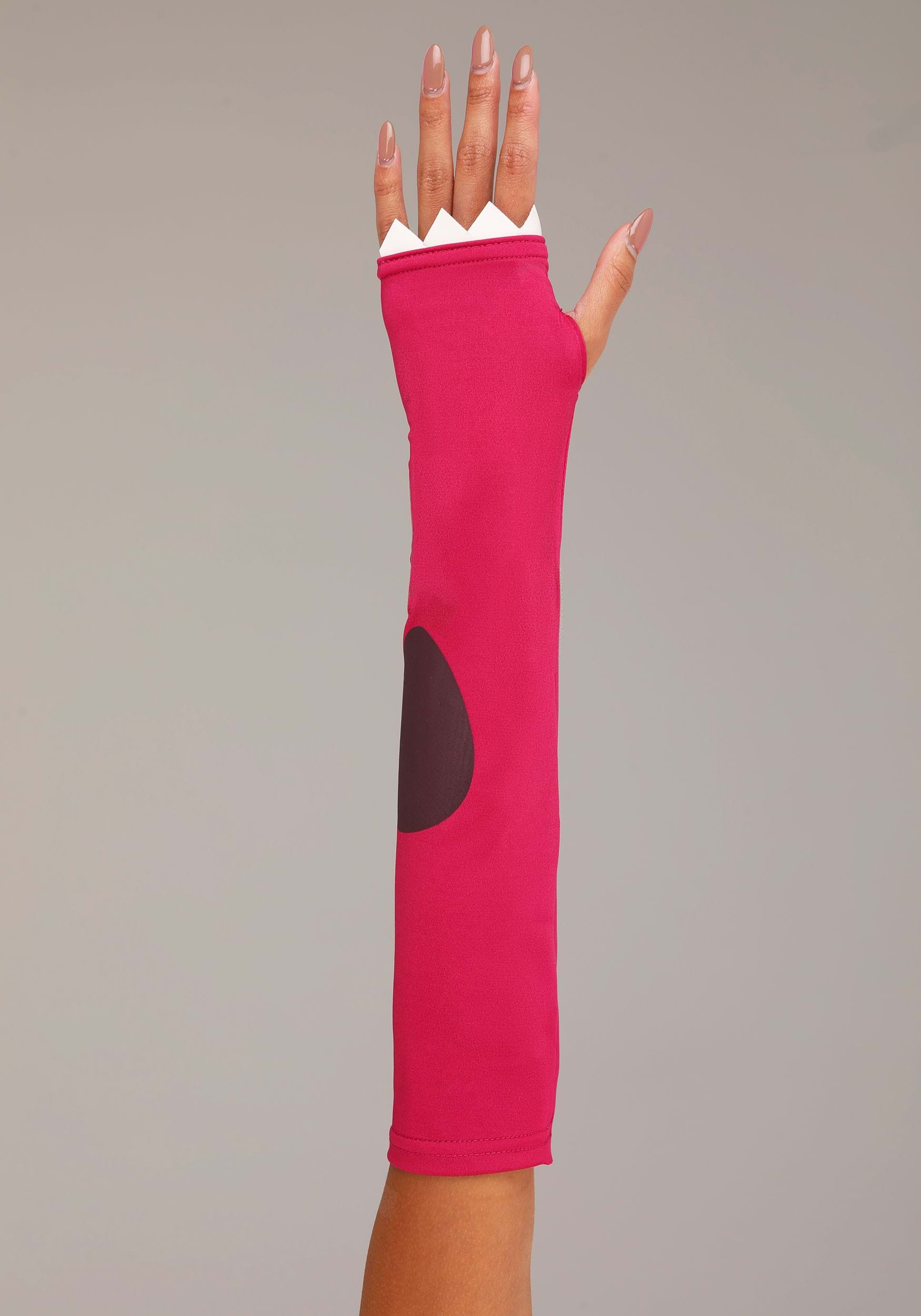 • Pair of elbow length, spandex gloves slide on, printed dino spots, vinyl spikes